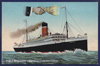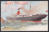 A company printed advertising art postcard showing an un-named company vessel. Card is by Wm. Strain & Sons, Belfast. Postally used by a passenger on board the Victorian in 1905. Very light corner and edge wear with a small dink to the top left corner tip. Album corner marks / impressions. Very light marking to the front with a partial postal cancellation in the top right corner near the funnel of the vessel. Very light marking / ageing to the reverse. (VG) |