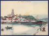 A company art card featuring Everard Vessels Loading and Discharging at Norwich, Norfolk. Art is by Frank H. Mason. Very light corner and edge wear. A little extremely light foxing dotting to the front, mostly only visible when viewed across the light. Very light marking to the reverse with a couple of very light foxing spots. Size approx 5.4" x 4". (VG) |